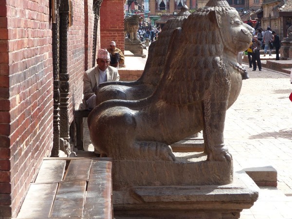 Es geht gnadenlos weiter nach Patan, ein Stadtteil Kathmandus, auch mal ein mächtiges Königreich. (WK) Wird auch Lalitpur Stadt der Schönheit, der schönen Künste genannt. Die älteste Stadt des Kathmandutales, aus dem 2. oder 3. Jahrhundert. Kleiner, ruhiger, buddhistischer. Der Stil etwas anders, besser erhalten. Eine lange Straße, die Gebäude in gutem Zustand.Rechts das alte Königsschloss aus dem 17. Jahrh. Schiene Holzfenster, zwecks Lüftung mit Gitter. Alte Männer im Gespräch. Unglaubliche Schnitzereien an den Stützen der Dächer.