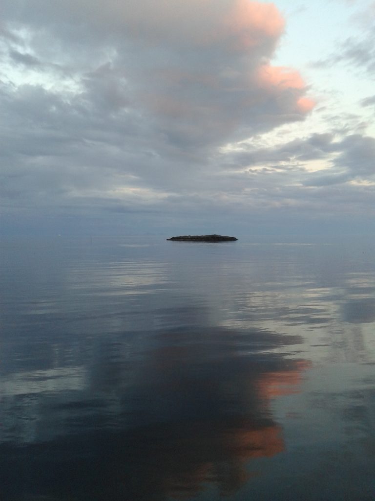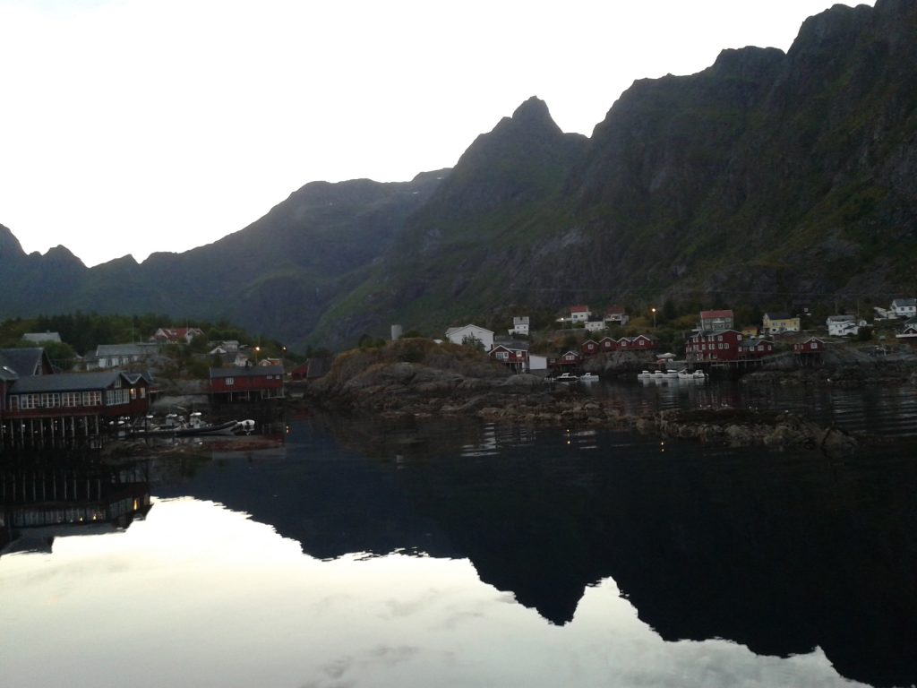 Der Himmel ist heute bedeckt. Gegenüber auf dem Festland sind die Berge unter der Wolkendecke von der Sonne beschienen.