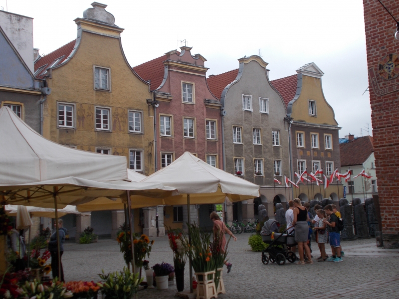Ein architektonisch interessantes Kaufhaus begegnet uns. So etwas abwechslungsreiches sollten wir bei uns auch mal bauen. Allenstein hat eine schöne kleine Altstadt. Das Hohe Tor aus dem 14. Jahrh., das im 19. Jahrh. als Gefängnis diente, die St.-Jakobus-Kirche von 1370/80, die heute für das draußen wartende Hochzeitspaar geschmückt ist. Dazwischen ragt der Turm der Burg empor, Kopernikus lässt grüßen. Der Marktplatz mit dem alten Rathaus, davor Skultpuren von Menschen als Mahnmal zum 100. Jahrestag des 1 . Weltkrieges. Es ist Marktzeit und viel los. Wir sitzen also wieder in einem Cafe, bewundern die schönen Barockgiebel der Häuser und gucken Leute.