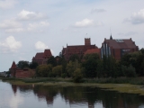 Gegen Abend kommen wir Malbork an, das frühere Marienburg. Die Marienburg war der Hauptsitz des Deutschen Ordens, den der polnische Herzog Konrad von Masowien 1225 ins Land geholt hatte, um die heidnischen Pruzzen zu christianisieren. Schon in den siebziger Jahren dieses Jahrhunderts begann der Orden mit dem Bau der Marienburg. Sie ist die größte Backsteinburg der Welt und breitet sich über 20 ha aus. Sie besteht aus der Vorburg, dem Mittel- und dem Hochschloss, alle drei Einheiten konnten getrennt verteidigt werden. Drumherum ein tiefer Graben, ein einziger Zugang. Als es dunkelt, wird sie beleuchtet. Ein gewaltiger Anblick, als wir mit Namkha noch einen Spaziergang auf dem Wall machen.