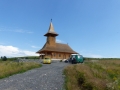 Wir fahren über Landstraße – wie wir es lieben. Kleine Orte, Heuhaufen in den Wiesen, an den Straßen wird Gemüse, Obst, Honig verkauft. Kühe werden mit dem Stock auf die Wiese getrieben. Glückliche Tiere! In Ohaba sehen wir eine offensichtlich neu gebaute Holzkirche, die wir uns natürlich an schauen müssen. Ein Pope und ein englisch sprechender Mann erklären uns die erst ein Jahr alte Kirche mit sehr schönen Ikonen. Wegen einer Marienikone gilt sie als Wallfahrtsort. Unterwegs in einem kleinen Ort schauen wir uns um. Beim Weiterfahren merken wir, dass der Hocker fehlt.Das war doch schon der wohl zwanzigste…